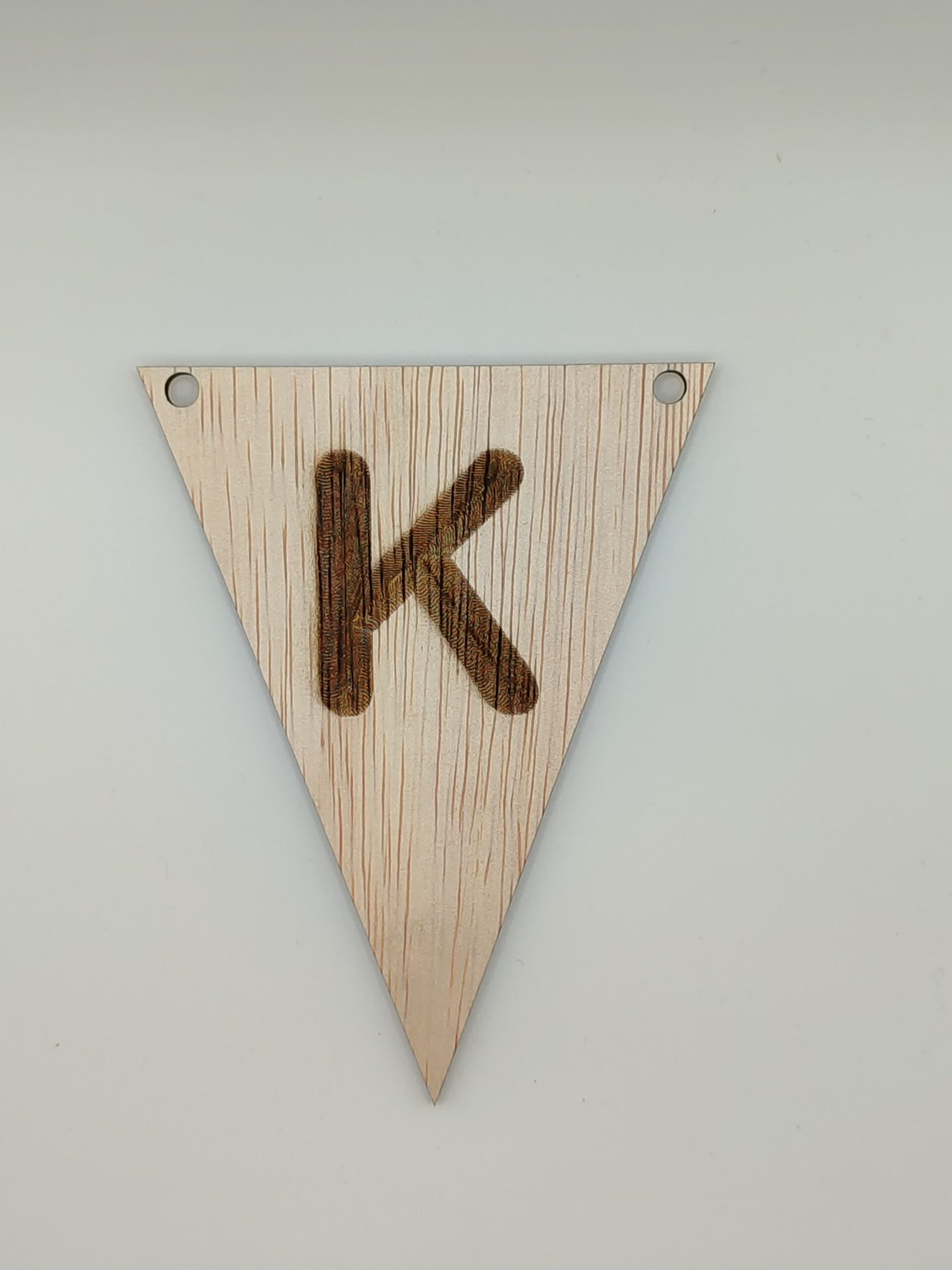 Dit houten vlaggetje met de letter K is met laserprecisie uitgesneden uit duurzaam hout. Dankzij het tijdloze ontwerp past het perfect bij verjaardagen, kinderkamers en feestdecoratie.