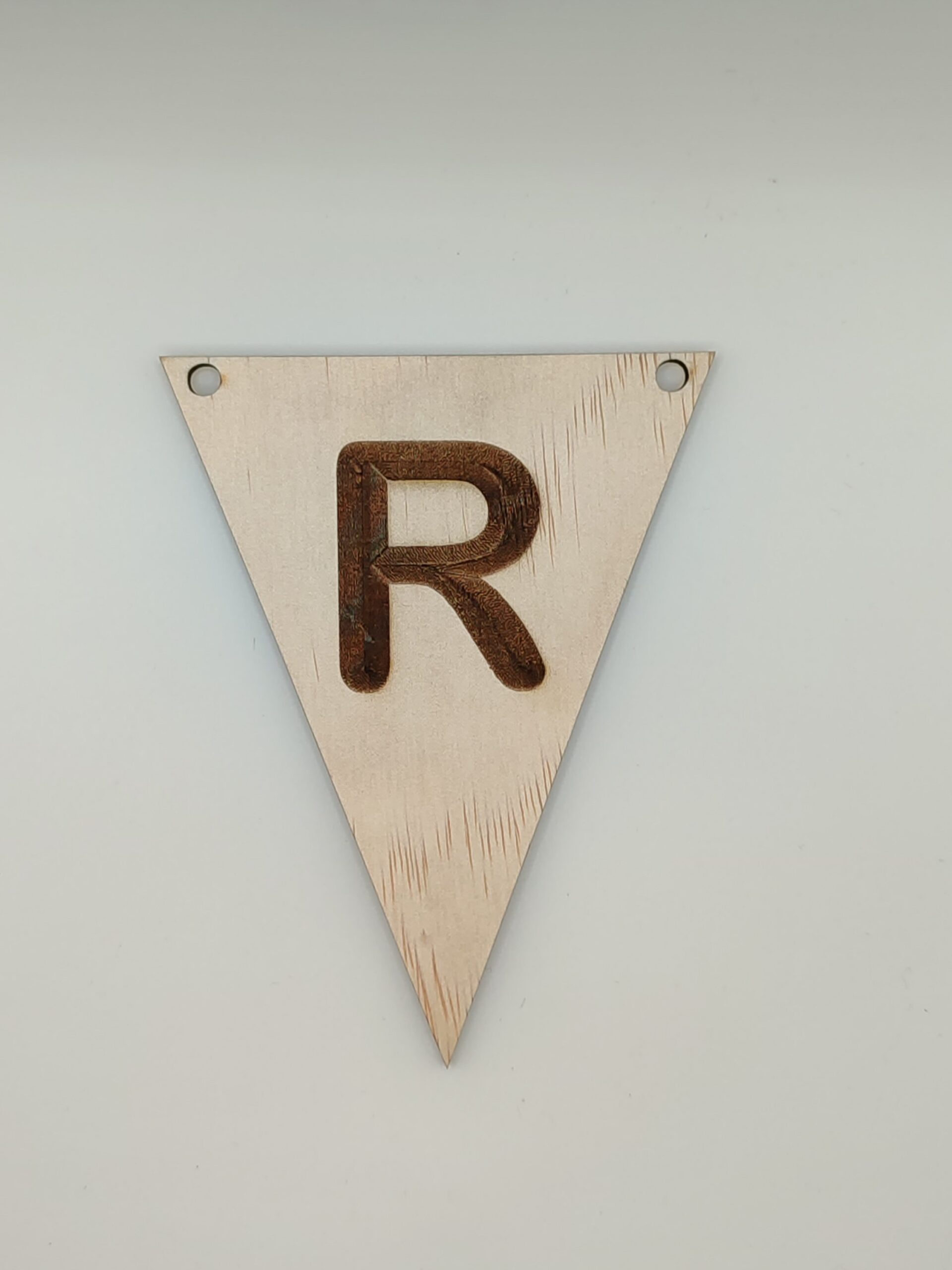 Houten vlaggetje met de letter R, strak gelaserd en perfect als decoratie voor feestjes, kinderkamers of speciale gelegenheden.