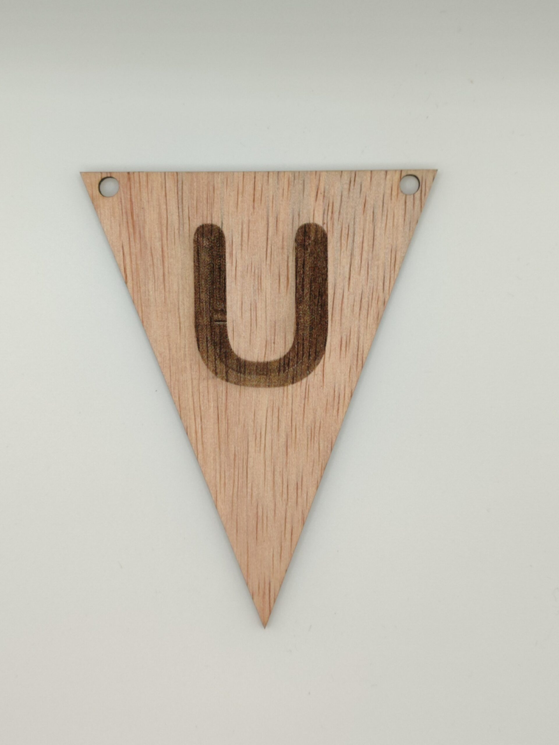 Houten vlaggetje met de letter U, strak gelaserd en perfect als decoratie voor feestjes, kinderkamers of speciale gelegenheden.